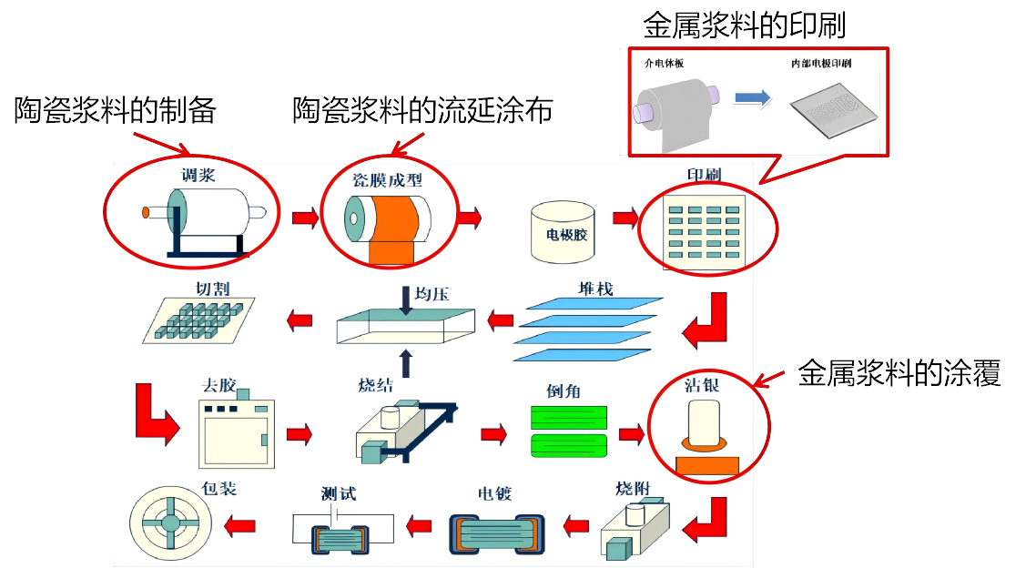 在MLCC的制作工藝中,會在制備和流延涂布環(huán)節(jié)用到陶瓷漿料,在印刷內(nèi)電極和涂覆外電極的環(huán)節(jié)用到金屬漿料。