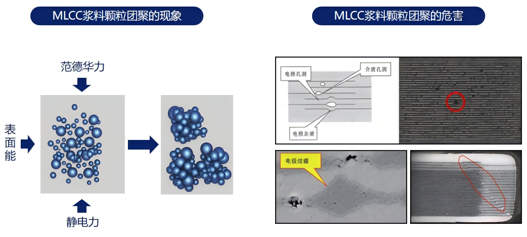雖然小型化、納米化的漿料顆粒有諸多好處,但是大家也知道,隨著顆粒越小,顆粒會因為范德華力、表面能、靜電力等作用而團聚在一起。漿料顆粒團聚會造成陶瓷介質(zhì)的空洞、電極雜質(zhì)、器件開裂等等不良,這些不良現(xiàn)象也是限制MLCC良率提升和高端化的桎梏。