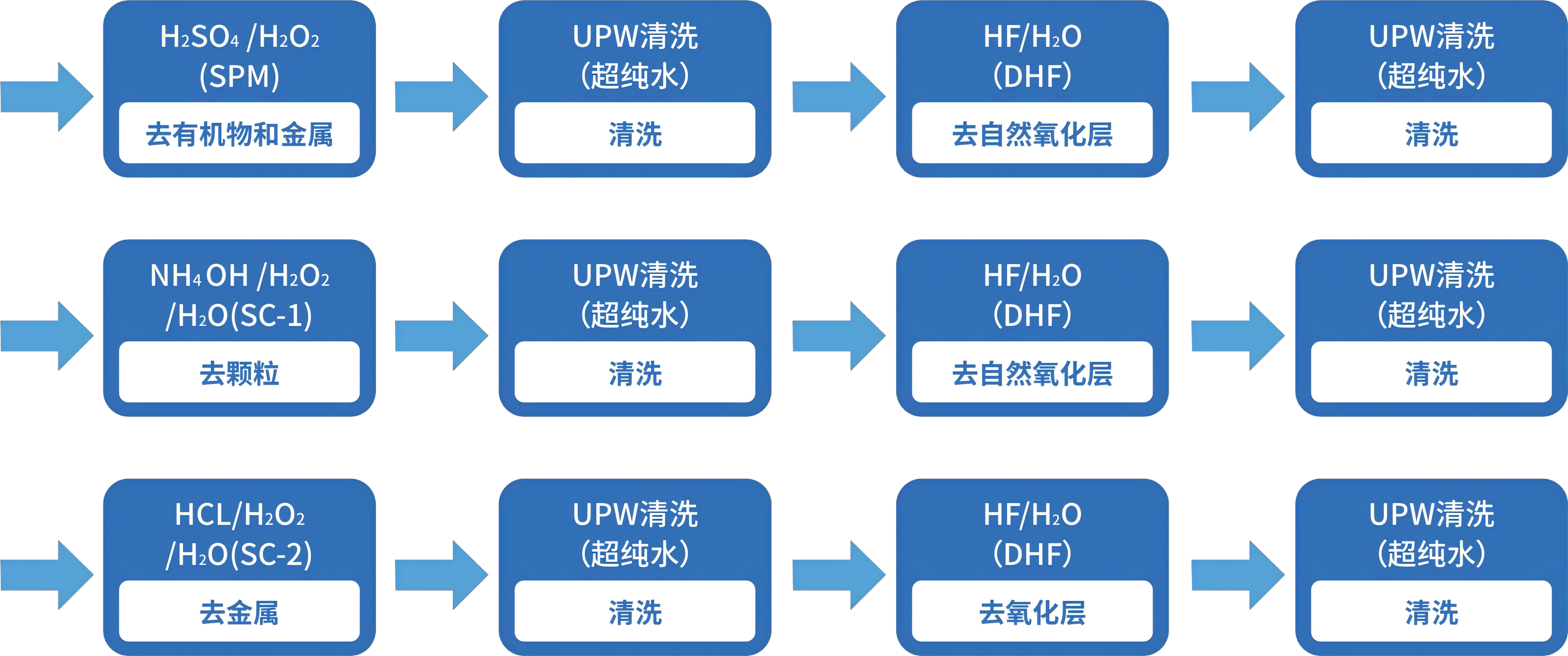 濕法清洗的清洗原理則是通過添加不同的化學(xué)試劑,與之對(duì)應(yīng)的污染物進(jìn)行反應(yīng),然后通過超純水沖洗連同試劑與污染物一并去除。截至目前濕法化學(xué)清洗技術(shù)仍是半導(dǎo)體IC工業(yè)中的主要清洗技術(shù),其中最為經(jīng)典的即是RCA清洗工藝。RCA清洗工藝是1965年由Kern和Puotinen等人在N.J.Princeton的RCA實(shí)驗(yàn)室提出的,主要由過氧化氫和堿組成的1號(hào)標(biāo)準(zhǔn)清洗液(SC-1)以及由過氧化氫和酸組成的2號(hào)標(biāo)準(zhǔn)清洗液(SC-2)進(jìn)行一系列有序的清洗。