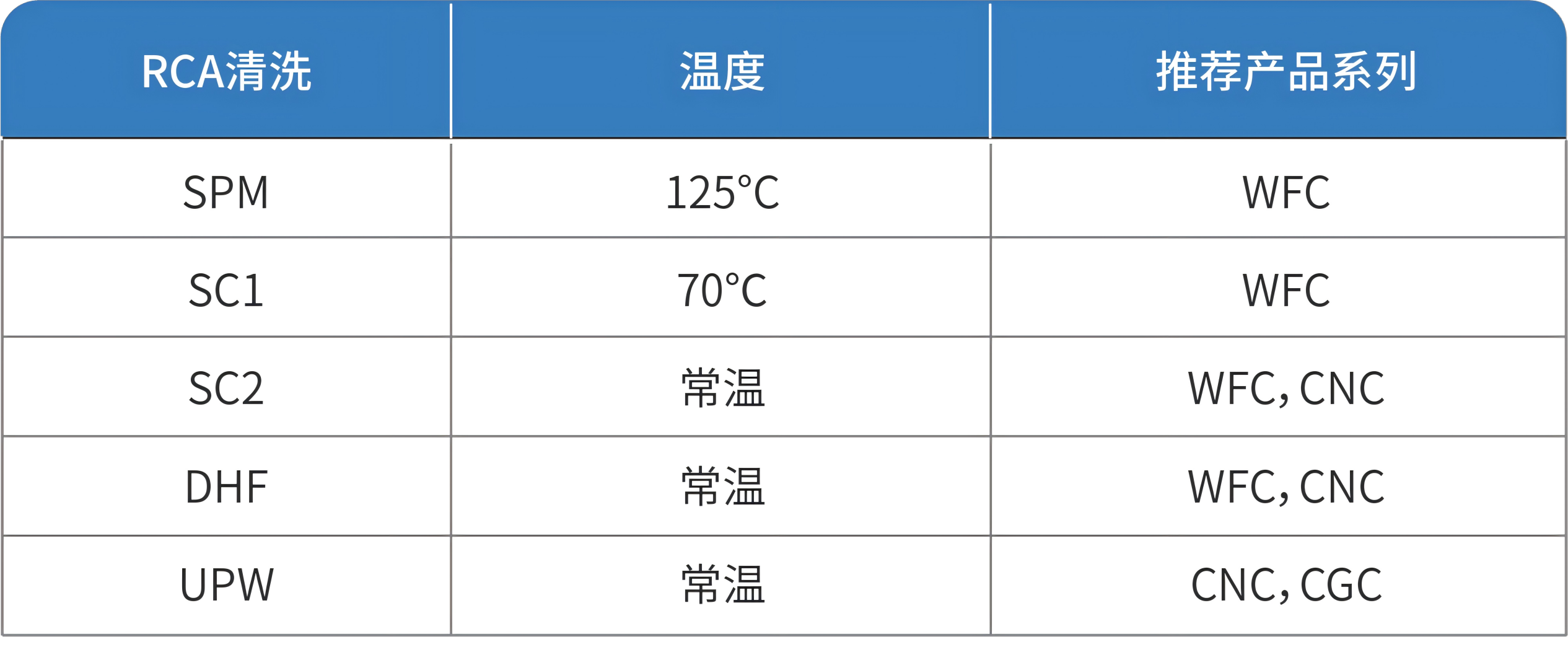 RCA清洗工藝技術(shù)的特點(diǎn)在于按照應(yīng)該被去除的污染物種類選擇相應(yīng)的濕電子化學(xué)品,按照順序進(jìn)行不同的清洗工藝,去除掉附著在硅片上的各種污染物。清洗液均是高潔凈度的電子級(jí)化學(xué)品,單價(jià)成本高,RCA清洗工藝設(shè)計(jì)中會(huì)將清洗液循環(huán)使用,由于循環(huán)使用的設(shè)計(jì),清洗液就需要增加過濾除雜工序。由前文介紹可知,RCA清洗中使用到了大量的酸與堿,因此在過濾雜質(zhì)的同時(shí)需要考慮濾芯對(duì)清洗液的耐受性。針對(duì)不同的使用點(diǎn)位,需要不同的濾芯匹配。邁博瑞深耕過濾行業(yè)數(shù)十年,擁有豐富的過濾解決方案,針對(duì)RCA清洗工藝,邁博瑞有如下的產(chǎn)品可供客戶選擇:
