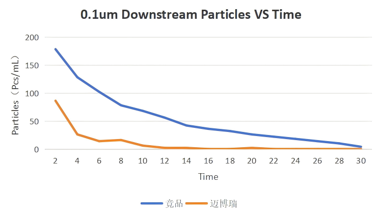 除此之外,高潔凈度濾芯的生產(chǎn)環(huán)節(jié)都有著嚴(yán)格的管控。第一,高潔凈度濾芯打折,焊接等生產(chǎn)工序在百級(jí)無塵車間,清洗工序在千級(jí)無塵車間中完成。第二,高潔凈度濾芯的原料進(jìn)行檢測分級(jí),并進(jìn)行初步清洗。第三,定制化的濾芯清洗流程,每一只濾芯都經(jīng)過多步驟的清洗。從下方圖表可知,通過多種有效的潔凈度管控,使得邁博瑞公司生產(chǎn)的濾芯金屬與顆粒脫落都達(dá)到一個(gè)較高潔凈度水平。