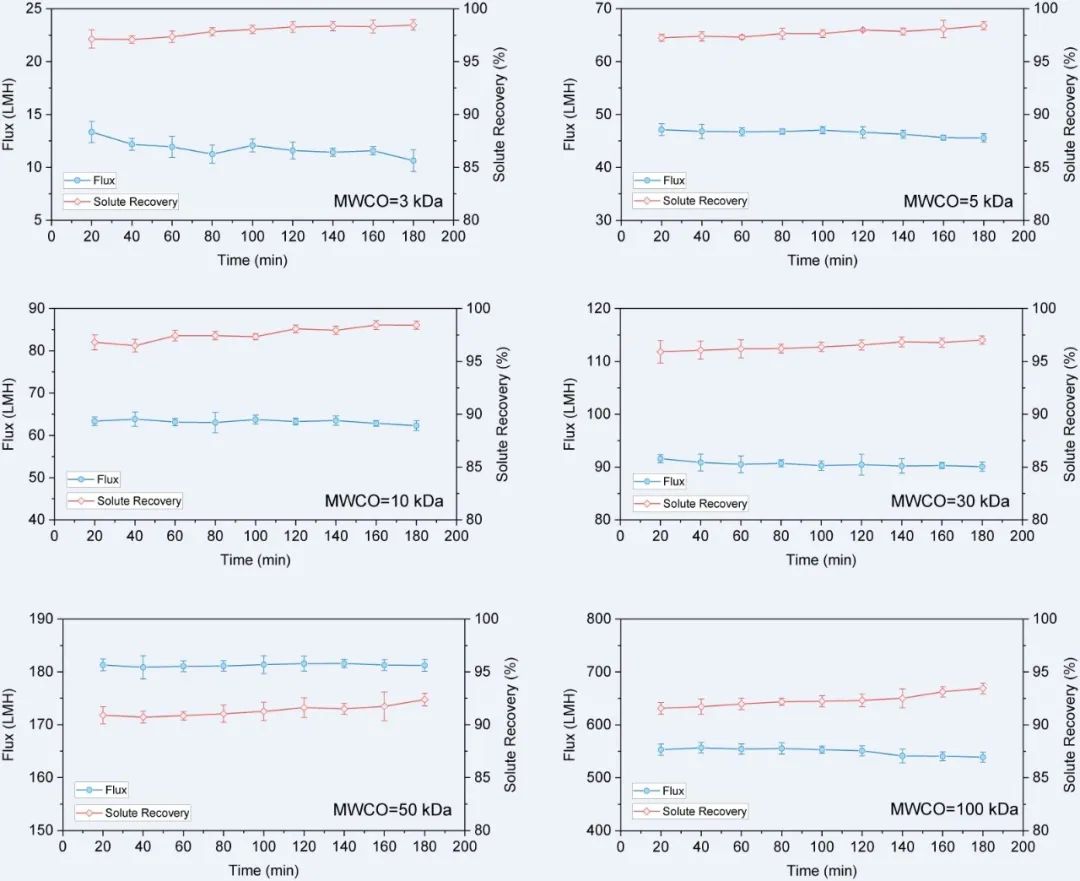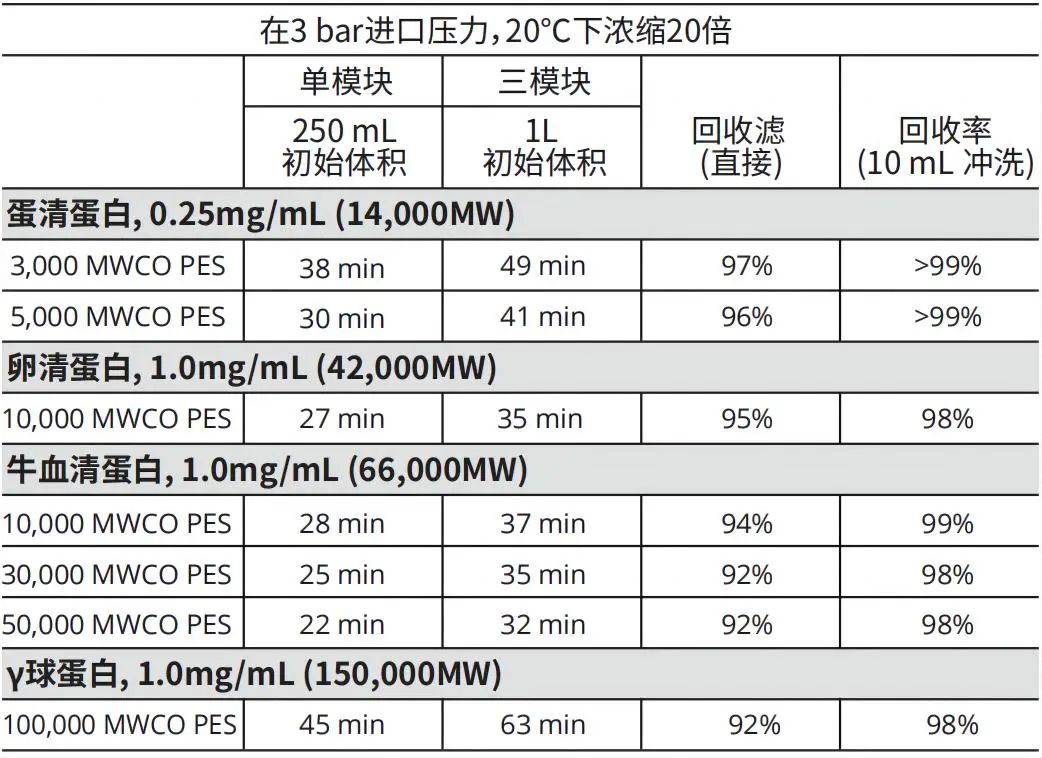 下面是我們配置了四種不同濃度的蛋白溶液包括蛋清蛋白, 0.25mg/mL (14,000MW)、卵清蛋白, 1.0mg/mL (42,000MW)、牛血清蛋白, 1.0mg/mL (66,000MW)、γ球蛋白, 1.0mg/mL (150,000MW)等,用我們不同分子截留的單模塊和三模塊的PRISM 50超濾膜包進(jìn)行截留,實(shí)驗(yàn)條件在3 bar進(jìn)口壓力,20℃下濃縮20倍,其平均直接回收率在94%以上,在10mL沖洗的條件下平均回收率達(dá)到98%以上,其過(guò)程對(duì)純水的通量總體恢復(fù)非常穩(wěn)定,沒(méi)有明顯的下降趨勢(shì)。