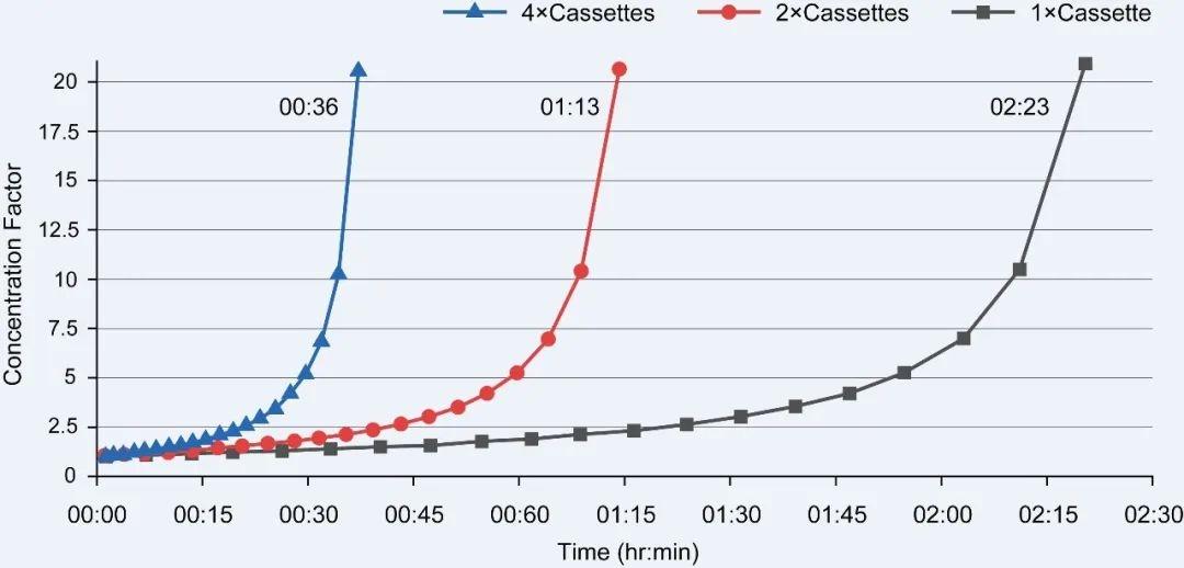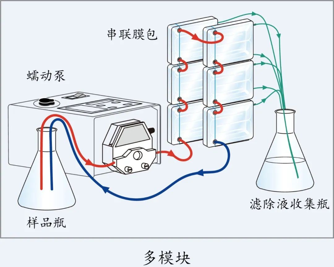 PRISM 50的模塊化設(shè)計(jì)使多個(gè)模塊串聯(lián)操作。這將最大吞吐量提高到3升,并與膜面積成比例地加快處理速度(見(jiàn)下圖)。